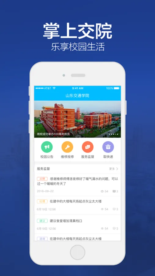 师生可通过App享受随时随地了解学校发布的公告信息、发起网络报修、反馈校园问题、遥控智能快递柜取包裹等服务,旨在为师生提供方便快捷且有价值的校园移动服务。