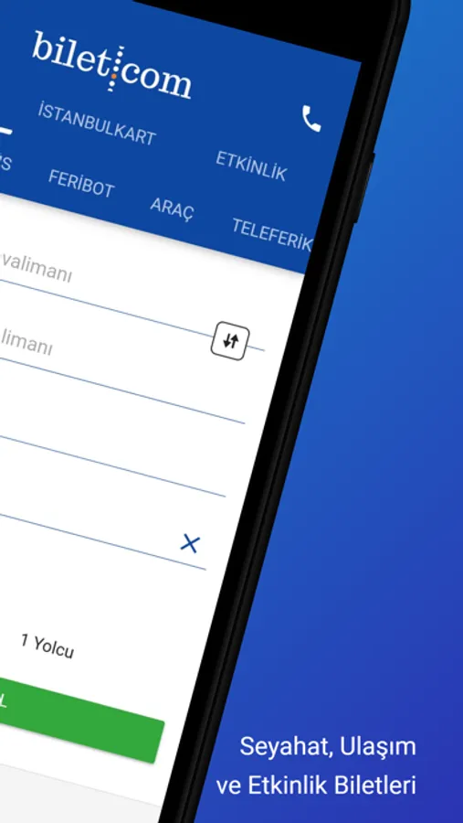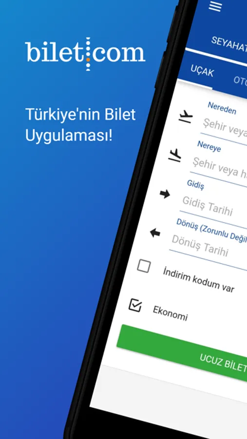 Bilet.com mobil uygulaması ile uçak bileti, otobüs bileti, İDO bileti, yunan adaları feribot bileti, Kıbrıs feribot bileti, etkinlik bileti satın alım ve araç kiralama rezervasyon işlemlerinizi gerçekleştirebilirsiniz.