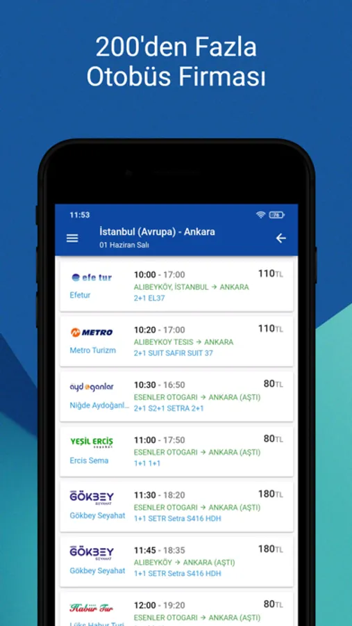 Metro Turizm, Süha Turizm, Pamukkale Turizm, Efe Tur, Balıkesir Uludağ, Anadolu Ulaşım, Isparta Petrol, Has Turizm, Kanberoğlu Turizm, Lüks Kahramanmaraş Turizm, Öz Diyarbakır ve daha birçok otobüs firmasının seferlerini tek ekranda görüntüleyebilir. Fiyatları karşılaştırabilir ve size en uygun otobüs biletini kredi veya banka kartınız ile satın alabilirsiniz.