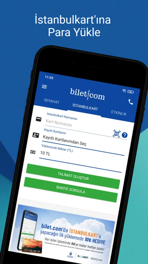 İstanbulkart'ınıza artık uygulamamız üzerinden para yükleyebilir, kartınızın son bakiyesini öğrenebilirsiniz. İlk yüklemeye 10 TL Hediye!