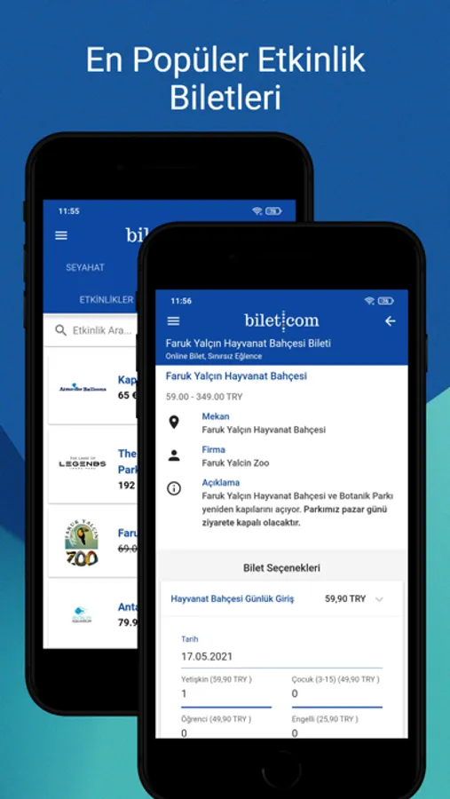 Türkiye'nin en popüler etkinlik biletleri Bilet.com'da. Bu uygulamamız ile İsfanbul, Land Of Legends, Faruk Yalçın Hayvanat Bahçesi, Emaar Akvaryum, Sea Life Akvaryum, Legoland Discovery, Madame Tussauds, Forest Kemerburgaz, Park Of İstanbul (POİ), Antalya Akvaryum, Bursa Extrem Park ve Kapadokya Balon Bileti satın alabilirsiniz.