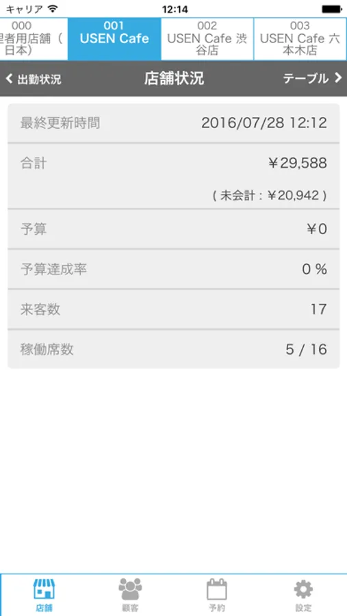 ■当日売上:当日売上の「合計」(会計済・未会計)が表示されます。また、「予算・達成率」「来客数」「可動席数」などの店舗状況も確認ができます。