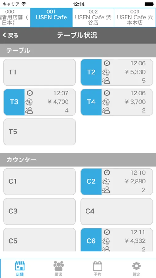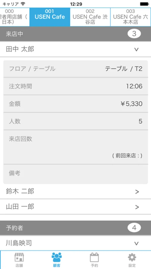 ■来店ステータス:来店者の「使用テーブル」「注文時間」「金額」「人数」「来店回数」が表示されます。その他に、予約者・退店者のステータス(「来店予定時間」「人数」など)も確認できます。