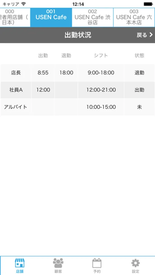 ■スタッフの勤怠:「出勤」「退勤」「シフト」の確認ができます。
