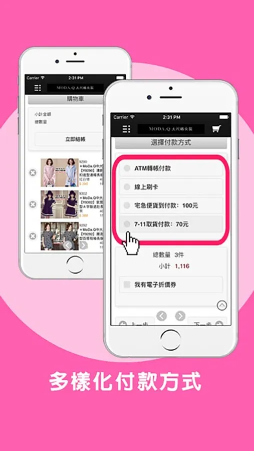 我們的購物APP提供方便快速的購物車和安全的結帳平台,可直接用Facebook快速加入會員購物,每星期不定時推出新款,也不定期推出超殺優惠,讓妳隨時掌握最新流行資訊,可將商品收藏最愛也可立即放入購物車快速結帳,可使用宅配收件、超商取貨付款、宅配貨到付款也可線上刷卡付款,讓妳輕鬆購物沒煩惱喔!