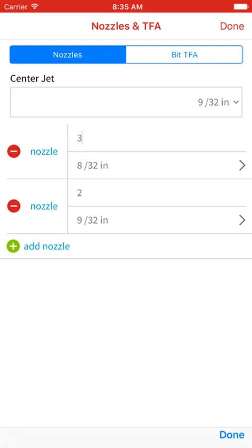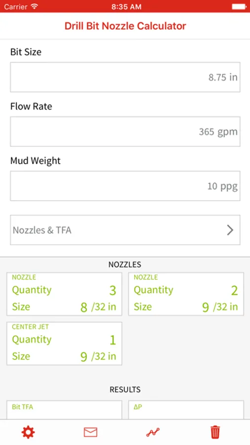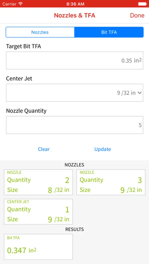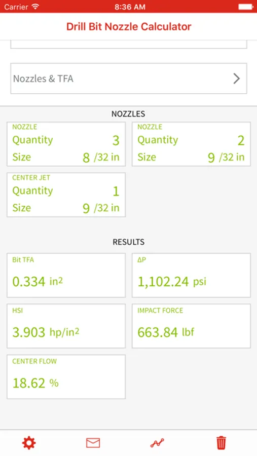 The Drill Bit Nozzle Calculator allows the user to quickly get results such as bit TFA, pressure drop, HSI, Impact Force, etc. based on inputs of bit size, flow rate, nozzles and mud weight. A reverse calculation of nozzle sizes for a desired total flow area and number of nozzles is also available.