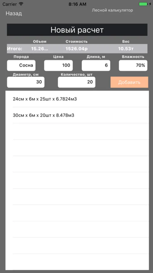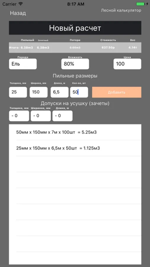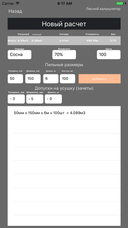 При вводе породы древесины и процента влажности вы получите точный вес полученного расчёта.