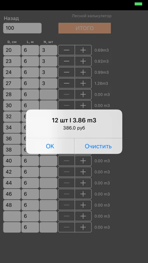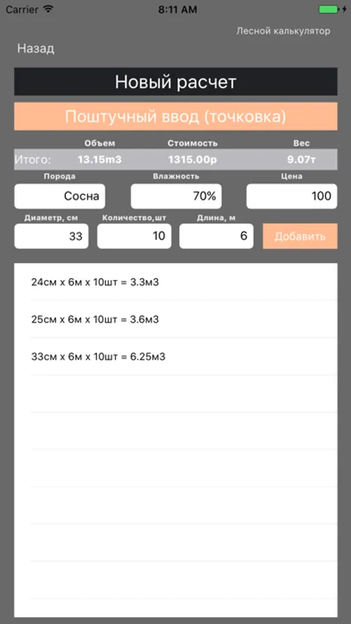 - Расчёт объёма круглых лесоматериалов с вводом данных поштучно;