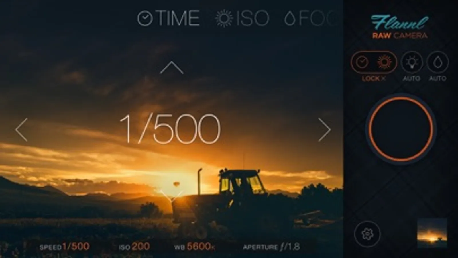 In addition to true RAW capture, Flannl brings a whole new way to set your camera's manual settings. Get precise exposure control fast with the full-screen selector. Scroll left-right to choose the setting mode. These include Shutter Speed (Time), ISO, Focus, and White Balance. Then simply scroll up or down to adjust the settings for each mode. Need full auto? It's as easy as tapping the Exposure, Focus, or WB lock buttons to clear them.