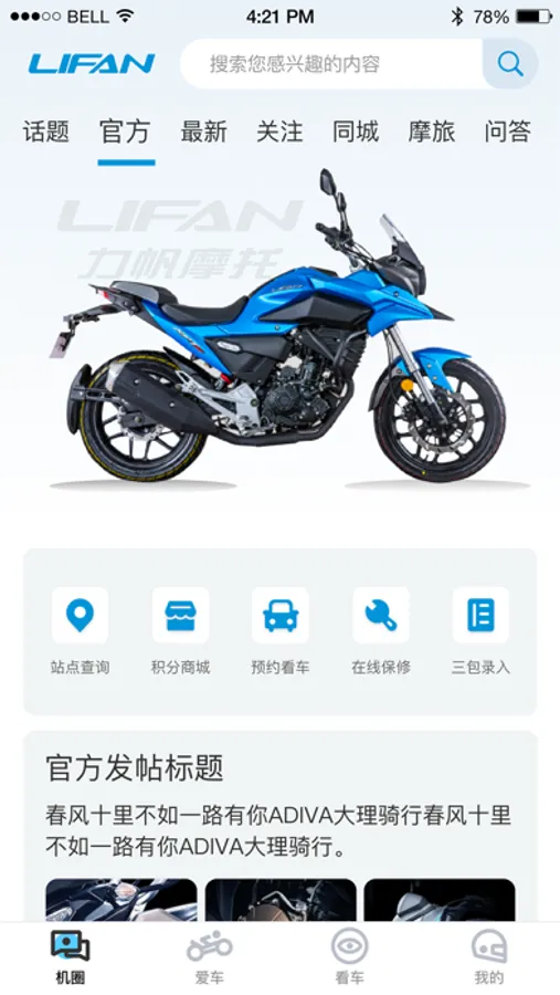 力帆摩托APP是力帆摩托为力帆车主及机车爱好者打造的一款社交生活软件,是力帆车主及机车爱好者开启智趣骑行、交流摩旅心得、展示机车生活、掌握机车资讯的任意门。设有发现、爱车、看车、商城、车友成长体系等智趣功能板块。