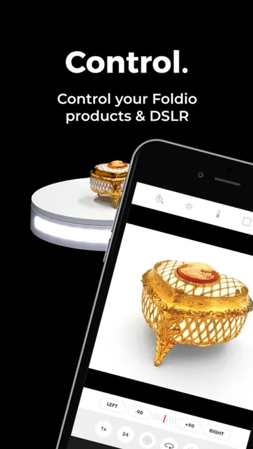 Foldio360 app controls the Foldio360 turntable and Foldio360 Smart Dome to create 360° visuals. Create high quality 360 images/videos/ GIFs and share them on your website.