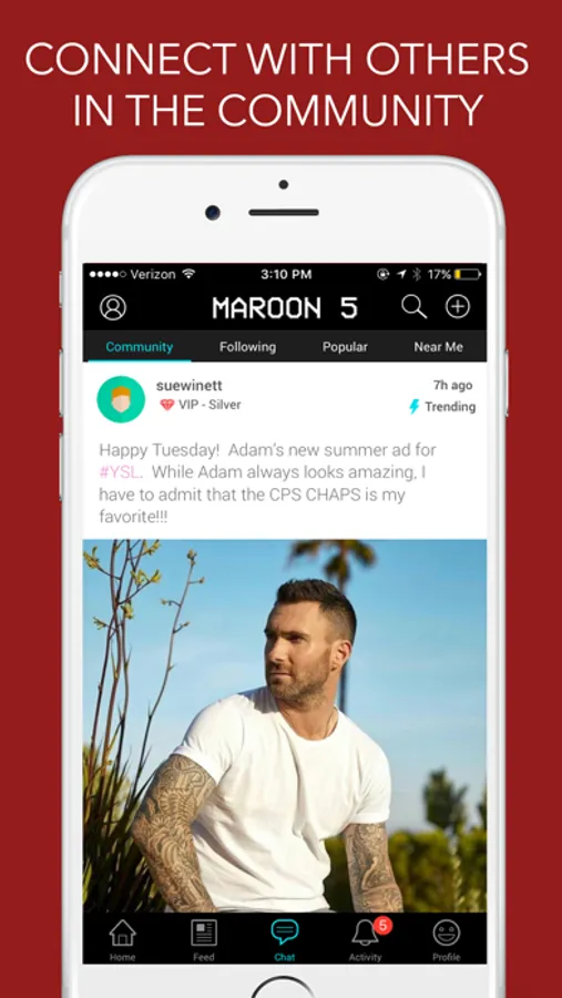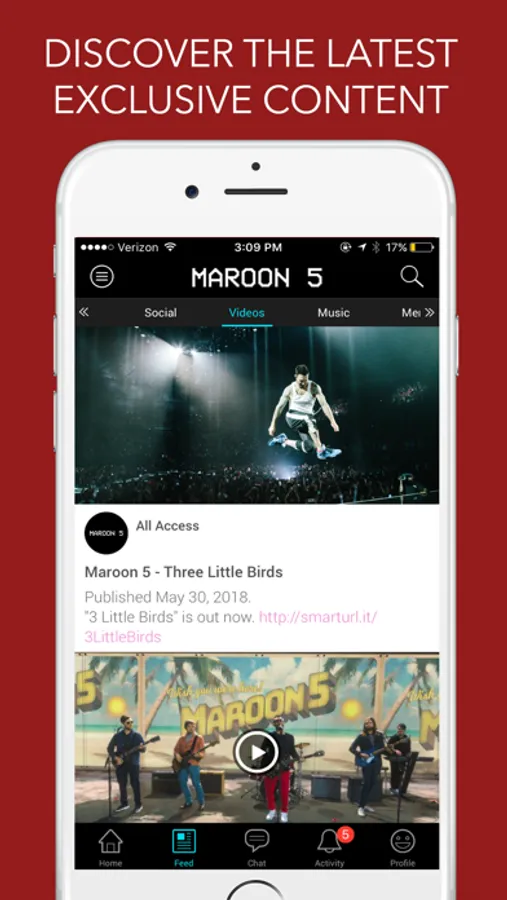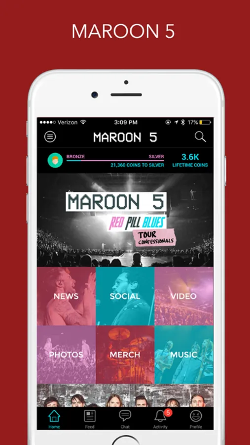Connect with Maroon 5 and the band's worldwide fan community. Stay up-to-date on the band's latest activities, meet fellow fans from the Maroon 5 S.I.N. Club and share your M5 stories. Take on in-app challenges, quizzes and polls to earn points for special offers and prizes