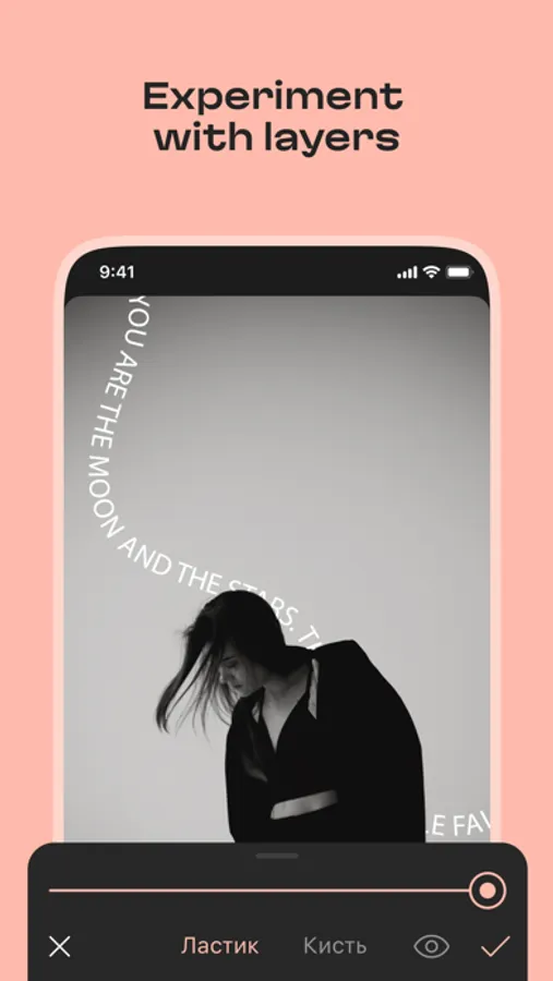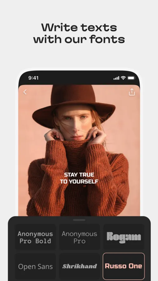 Add texts to your pictures. AppForType now has 60 fonts, half of them support cyrillic characters. You can also choose from 750 readymade texts and stickers for bloggers, travellers and lovers. We regularly add new goodies to our collection.