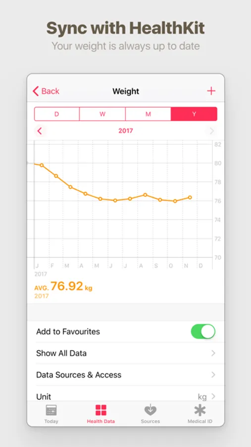 Easily enter in your weight and it will be saved to your iPhone's secure HealthKit store. Ideal for those who prefer to manually track their weight regularly.