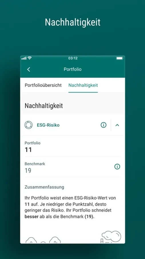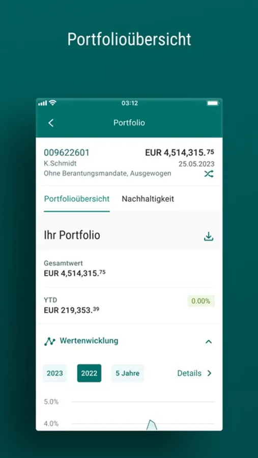 • Portfolio: Wertentwicklung, Struktur der Anlageklassen, Einzelbestandsübersicht mit weiteren Details je Instrument sowie das Nachhaltigkeitsdashboard.