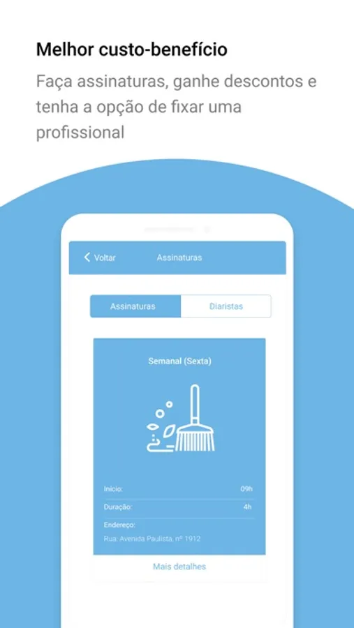 ► Ah, e no modelo de assinatura você pode escolher um time de profissionais preferenciais e até solicitar que se vincule uma prestadora específica para te atender nos serviços domésticos desejados, como de faxina em casa, passar roupa e de limpeza profissional de escritório e consultório.