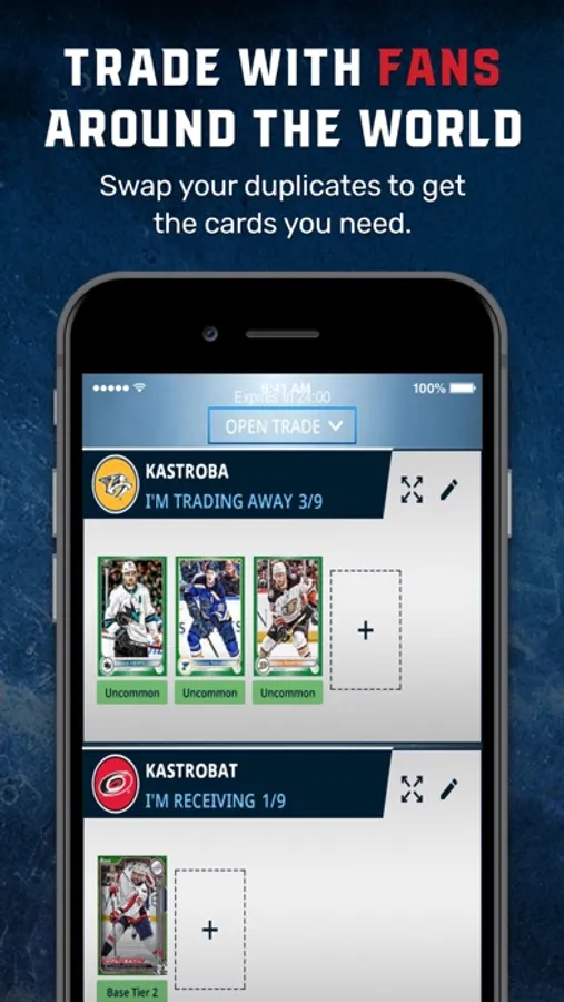 Topps® NHL SKATE™ Card Trader is the official digital trading card app of the NHL, NHLPA, NHLAA! Join a passionate community of hockey fans from around the world that enjoy collecting and trading Topps NHL cards and bringing their collections to life with fun, interactive in-app features! Unlock a world where you can celebrate the NHL players and iconic moments you love with the convenience of ripping packs from your mobile device! Set lineups using Topps NHL cards in your collection that score every goal, save, shot, assist – all in real-time! Collect your favorite players and teams showcased through classic Topps card designs, original artwork, player autographs, relics, and more!