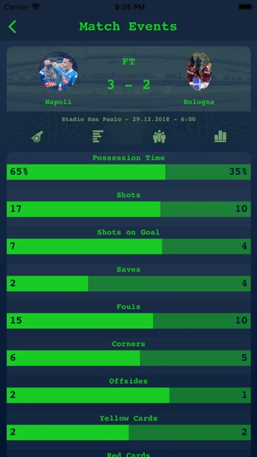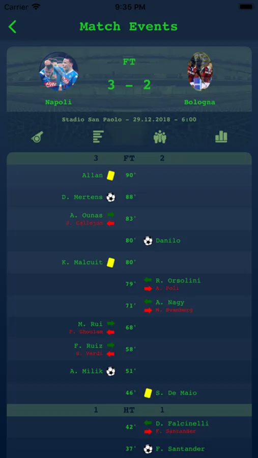 • Events match, with goals, own goals, assists, red and yellow cards and substitutions.