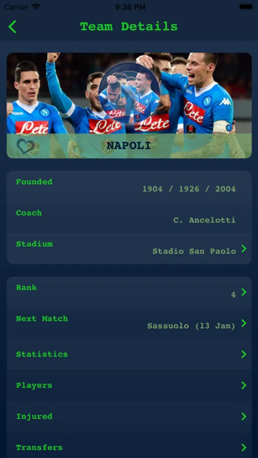 • Club details, ranking, next match, statistics, players, injuries and transfers.