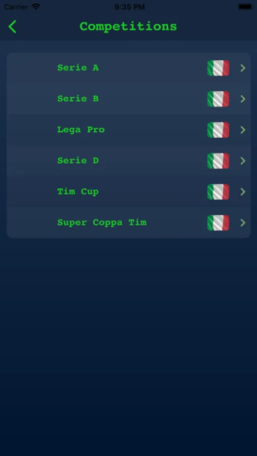 • Leagues: Serie A, Serie B, Lega Pro, Serie D, Italian Cup, Super Cup