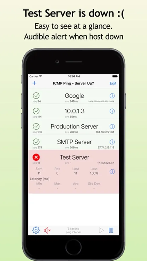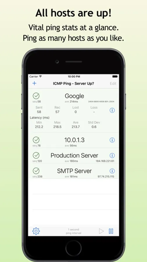 Check if your servers are up by pinging them. Ping uses the ICMP protocol and records how long it takes a packet to reach a particular host and be sent back. If that packet is never received, then this can indicate that the server or some part of the network is down. Think of it as an early warning!