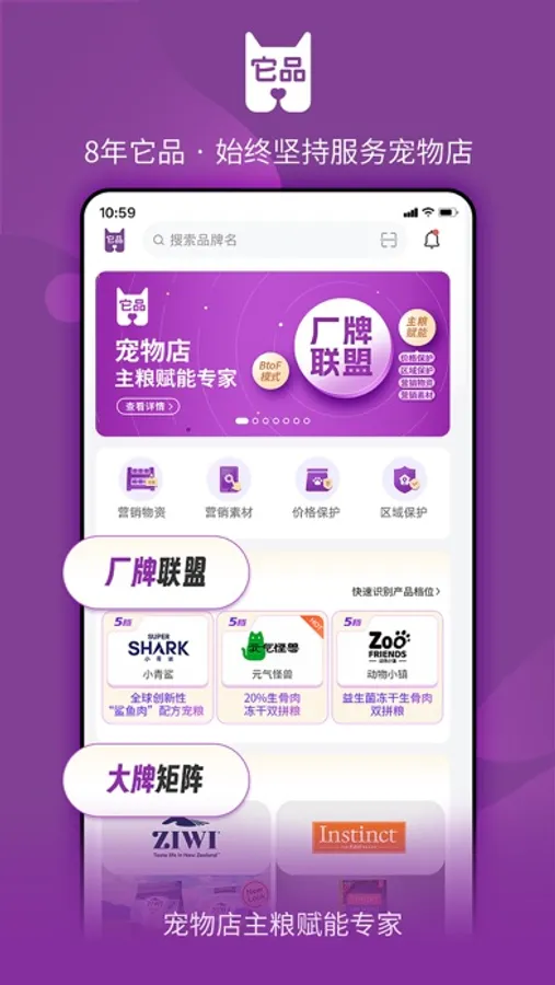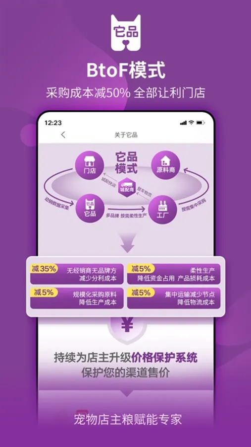 它品成立于2016年,专注为宠物店提供优质主粮和赋能服务。不断深化它品模式,集成全国门店的销售需求来驱动生产,实现宠物店采购价优势最大化。