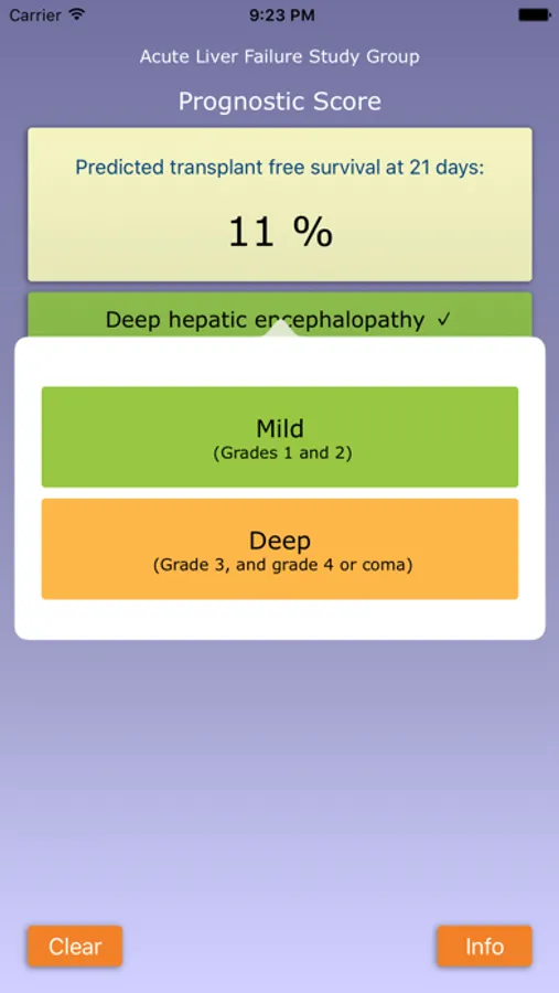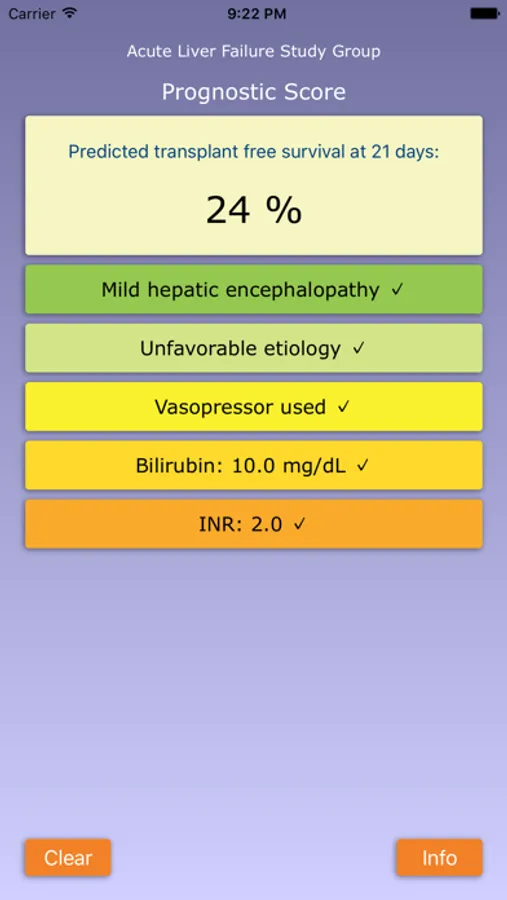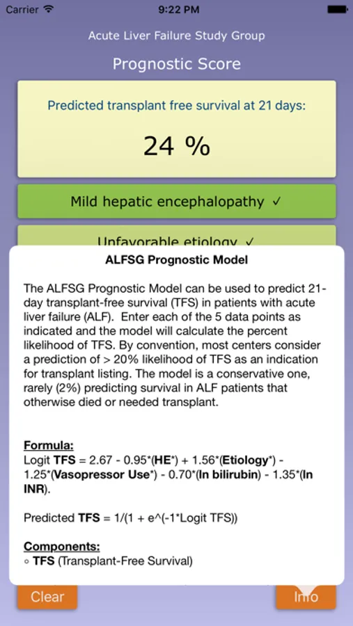 The ALFSG Prognostic Model can be used to predict 21-day transplant-free survival (TFS) in patients with acute liver failure (ALF). Enter each of the 5 data points as indicated and the model will calculate the percent likelihood of TFS. By convention, most centers consider a prediction of > 20% likelihood of TFS as an indication for transplant listing. The model is a conservative one, rarely (2%) predicting survival in ALF patients that otherwise died or needed transplant.