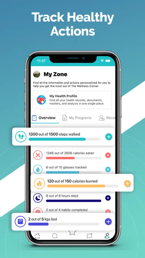 The Wellness Corner app enables you to connect with various health experts, track your calorie intake and burnout levels, manage your health records, assess your current health risk(s), connect with other fitness devices to sync your steps, and explore our wellness content.