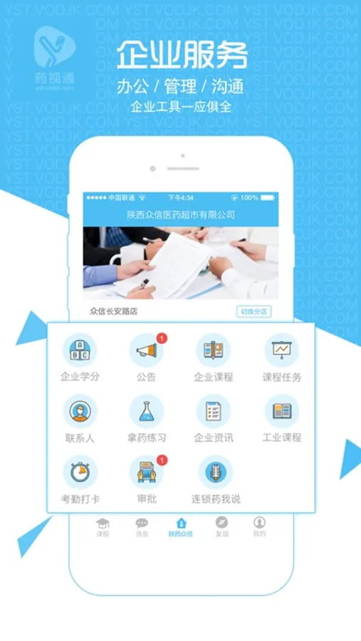 除学习培训之外,药视通还提供了企业服务功能,企业公告、企业通讯录、考勤、请假、简单易用的企业管理工具,借助移动APP,让您通过手机轻松管理连锁药店。
