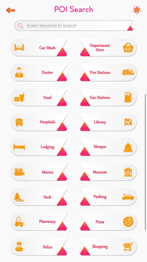 Airport, ATM, Bank, Bars, Beauty Salon, Bus Station, Cafe, Campground, Car Wash, Department Store, Doctor, Fire Station, Food, Gas Station, Hospital, Library,Lodging, Mosque, Movies, Museum, Park, Parking, Pharmacy, Pizza, Police, Shopping, Stadium, Taxi, Train Station, Travel Agency, University, Zoo.