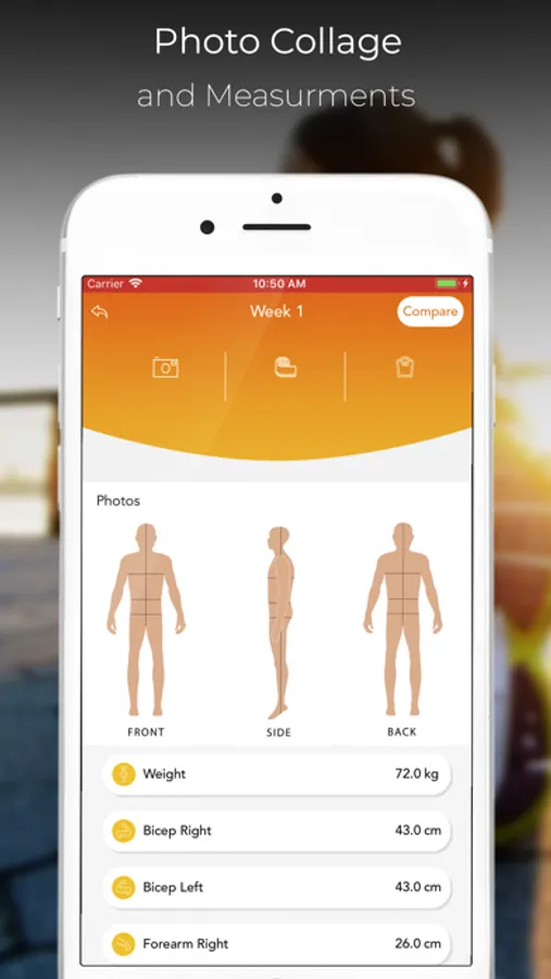 + Track your body progress by taking weekly pictures and record body measurements