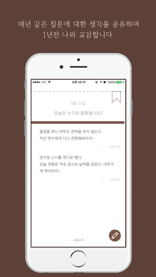 생활 속의 가벼운, 때로는 진중한, 어쩌면 실질적인, 또는 위트있는 나의 생각을 기록하세요. 매년 그 생각을 지금의 나와 공유합니다.