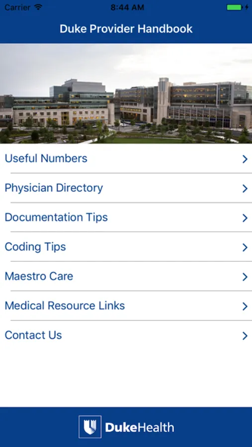 This app is designed to provide Duke Health providers with information to assist them with their daily practice including commonly used telephone numbers, physician directory, documentation tips, coding tips, electronic health record resources, and medical resources
