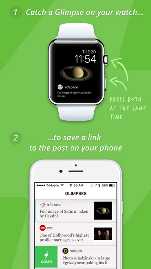 -All-New "Catch a Glimpse" Feature lets you save Glimpses to your phone! Simply screenshot the Glimpse on your Apple Watch by pressing the side button & crown simultaneously and a link to the full post will automatically be saved in your Glimpse app on your phone. It's magic!