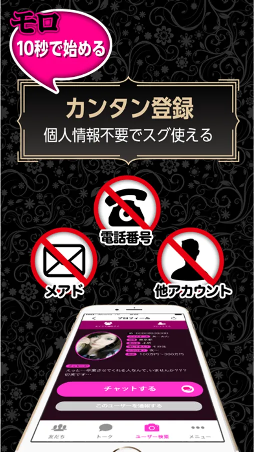 登録して10秒でチャットが始められる。