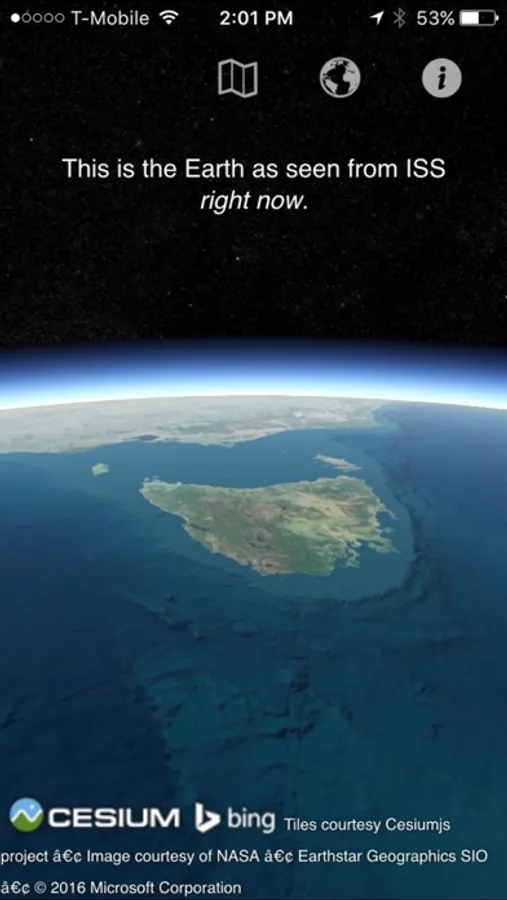 Though earth imagery is rendered, current position of camera/ISS is real. This is the portion of earth as seen from the ISS right now!