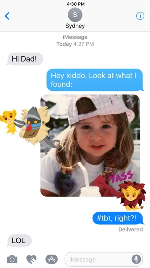 Express yourself in new ways with dynamic and animated Disney Stickers you can put anywhere in your chat. Scale, rotate, and layer stickers—even place them on photos you send and receive! Discover all our sticker packs in the iMessage App Store including Disney's Beauty and the Beast, Pixar's Finding Dory, and more. Use Disney Stickers to add magic to your iMessages!