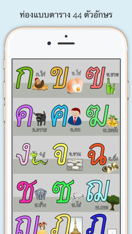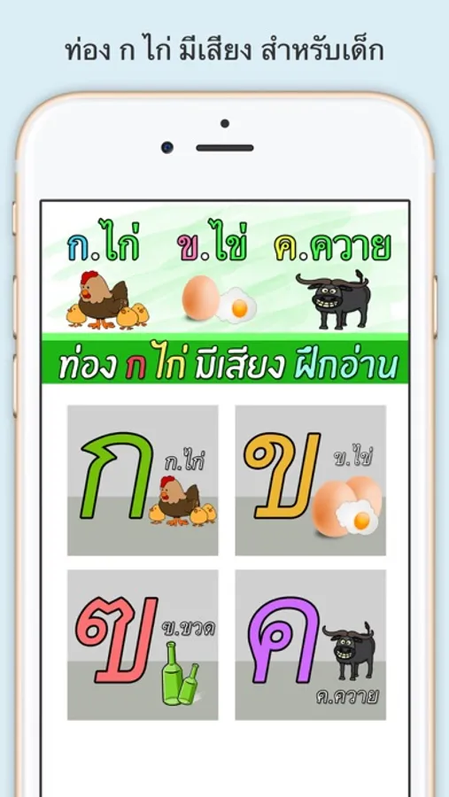 แอพที่ช่วยบุตรหลานของท่านให้ได้ฝึกท่อง ก ไก่ ถึง ฮ นกฮูก ได้อย่างง่ายดาย ประกอบไปด้วยภาพ ของพยัญชนะ 44 ตัวในภาษาไทย คือ ก ข ฃ ค ฅ ฆ ง จ ฉ ช ซ ฌ ญ ฎ ฏ ฐ ฑ ฒ ณ ด ต ถ ท ธ น บ ป ผ ฝ พ ฟ ภ ม ย ร ล ว ศ ษ ส ห ฬ อ ฮ และเสียง อ่านแต่ละพยัญชนะ ให้เด็กๆ จดจำ ก เอ่ย ก ไก่ ถึง ฮ นกฮูก ตาโต ได้อย่างแม่นยำ