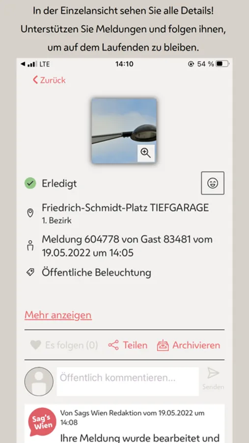 Issues will be displayed in list-, map- or detail views. Users can support other issues or "follow" them. With a personal profile you can even use Vienna Calling on different devices.