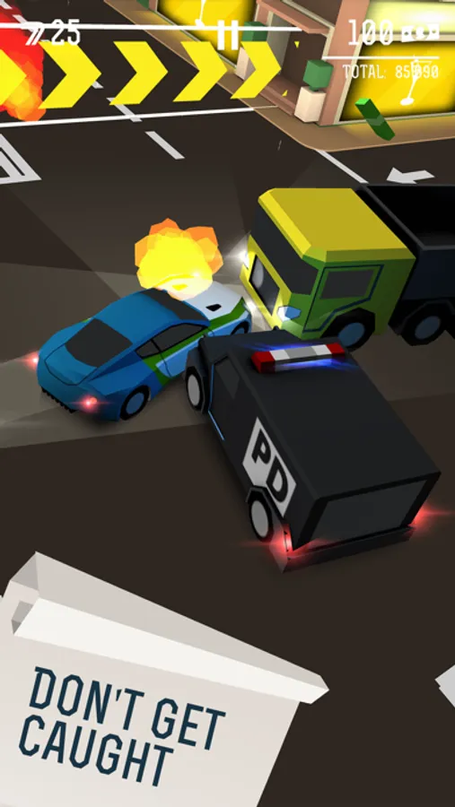 Robbing a bank has never been easier - you just need to handle a simple one tap mechanics to hit the road. A working thumb is literally everything you need. Beware of the police though as they won’t stop chasing and trying to smash you. If you hit another car or a building during the chase, you're busted. You have a long way ahead of you and plenty of time to develop your skill and to find out if you can beat your friends on the global leaderboards.