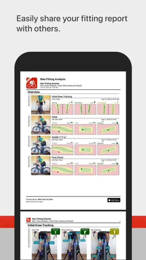 Generate a comprehensive PDF report of your bike fitting session to easily share with others.