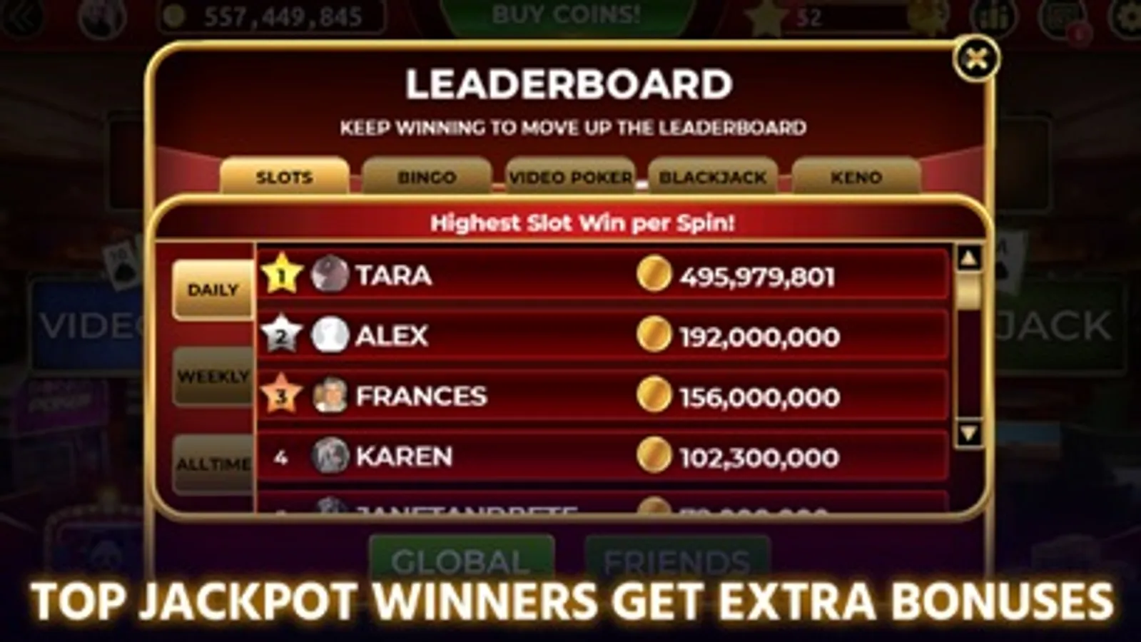 • Play in our interactive JACKPOT Lounge for even more chances to win! Highest individual wins can land you on the LEADERBOARD for even MORE coins!