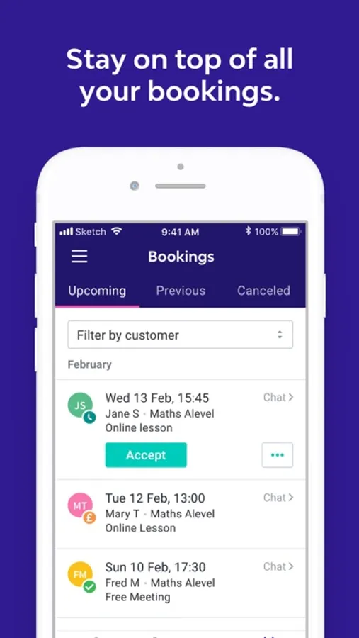 • View upcoming, completed and cancelled bookings with the app’s calendar feature.