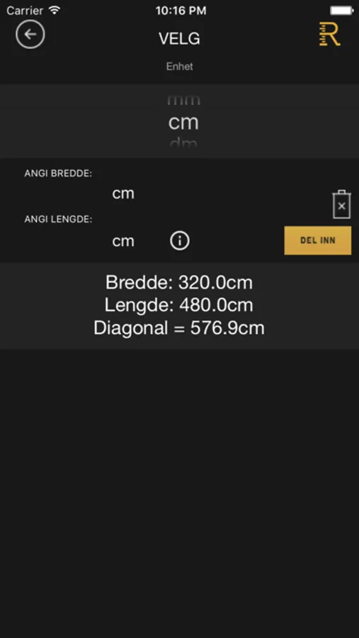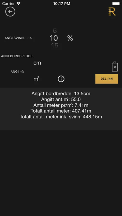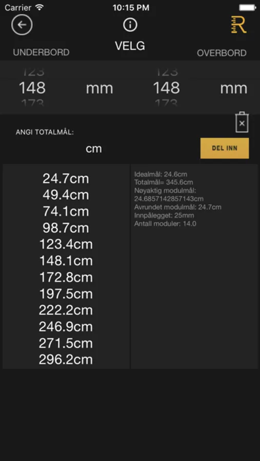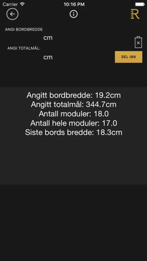 Appen hjelper deg med å dele inn, regne ut diagonalen, beregne material mengde, regne ut bredde av siste bordbredde.