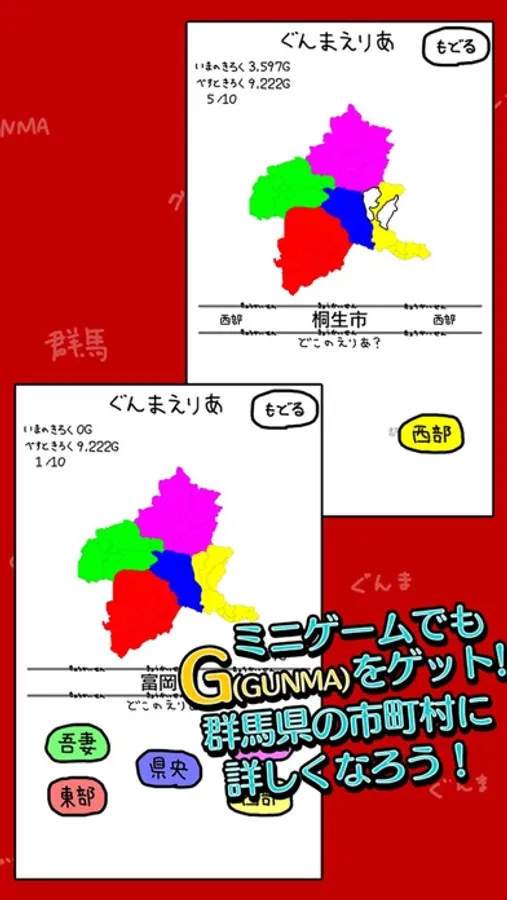 群馬県の市町村の位置を5つのエリアにわけ、市町村名からそれがどのエリアなのかを当てるゲームです。