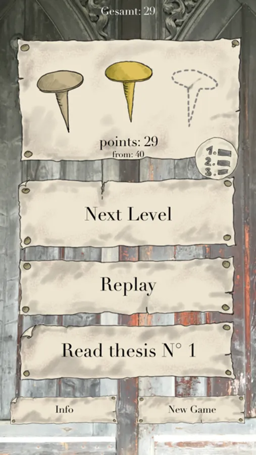 In the game you can help Martin Luther nailing his ninty-five theses to the door of the All Saints' Church in Wittenberg. Each thesis is a level - but you have to be fast, because it's getting harder each level. Some nails are helpful, some are not. Try to gather as much points as possible by hitting the most valuable nails!