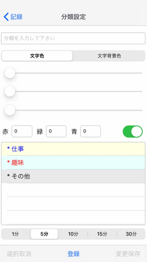 ※下段にある分選択は、記録を登録する時刻を何分単位にするかの選択になります。