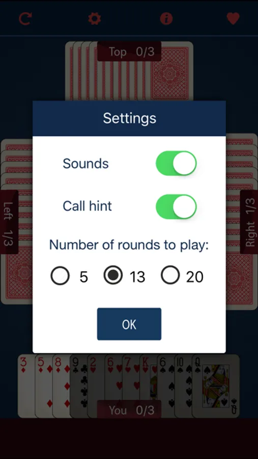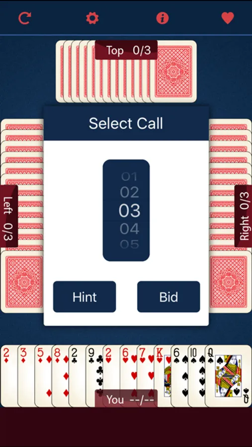 Deal and play are counter-clockwise.To succeed, a player must win the number of tricks called, or more trick than the call. If a player succeeds, the number called is added to his or her cumulative score. Otherwise the number called is subtracted. After the end of fifth or 13th of 20th round the winner is decided, player with higher total points is considered as the winner of the game.