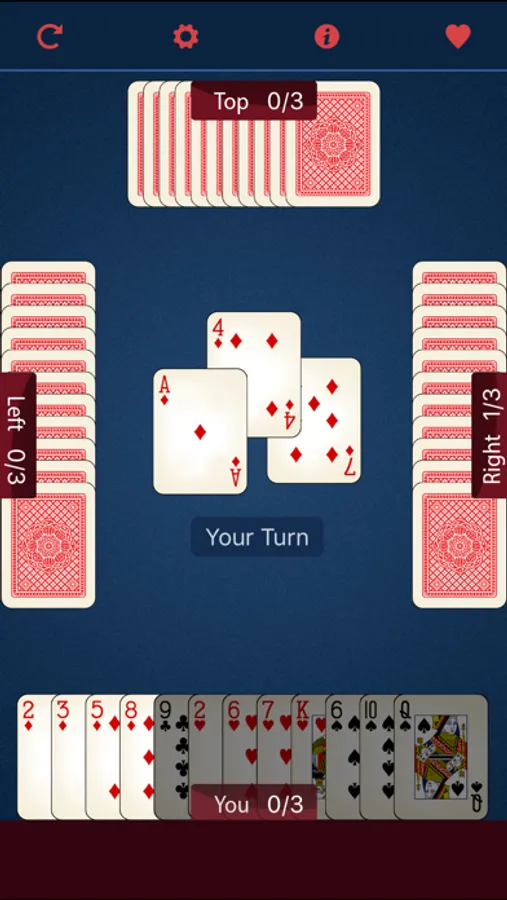 The cards of each suit rank from high to low A-K-Q-J-10-9-8-7-6-5-4-3-2. Spades are permanent trumps: any card of the Spade suit beats any card of any other suit.