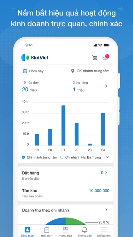 Ứng dụng giúp bạn dễ dàng theo dõi, giám sát hoạt động bán hàng của các chi nhánh, đồng thời giúp bạn so sánh đánh giá hiệu quả kinh doanh của mỗi chi nhánh trong hệ thống.